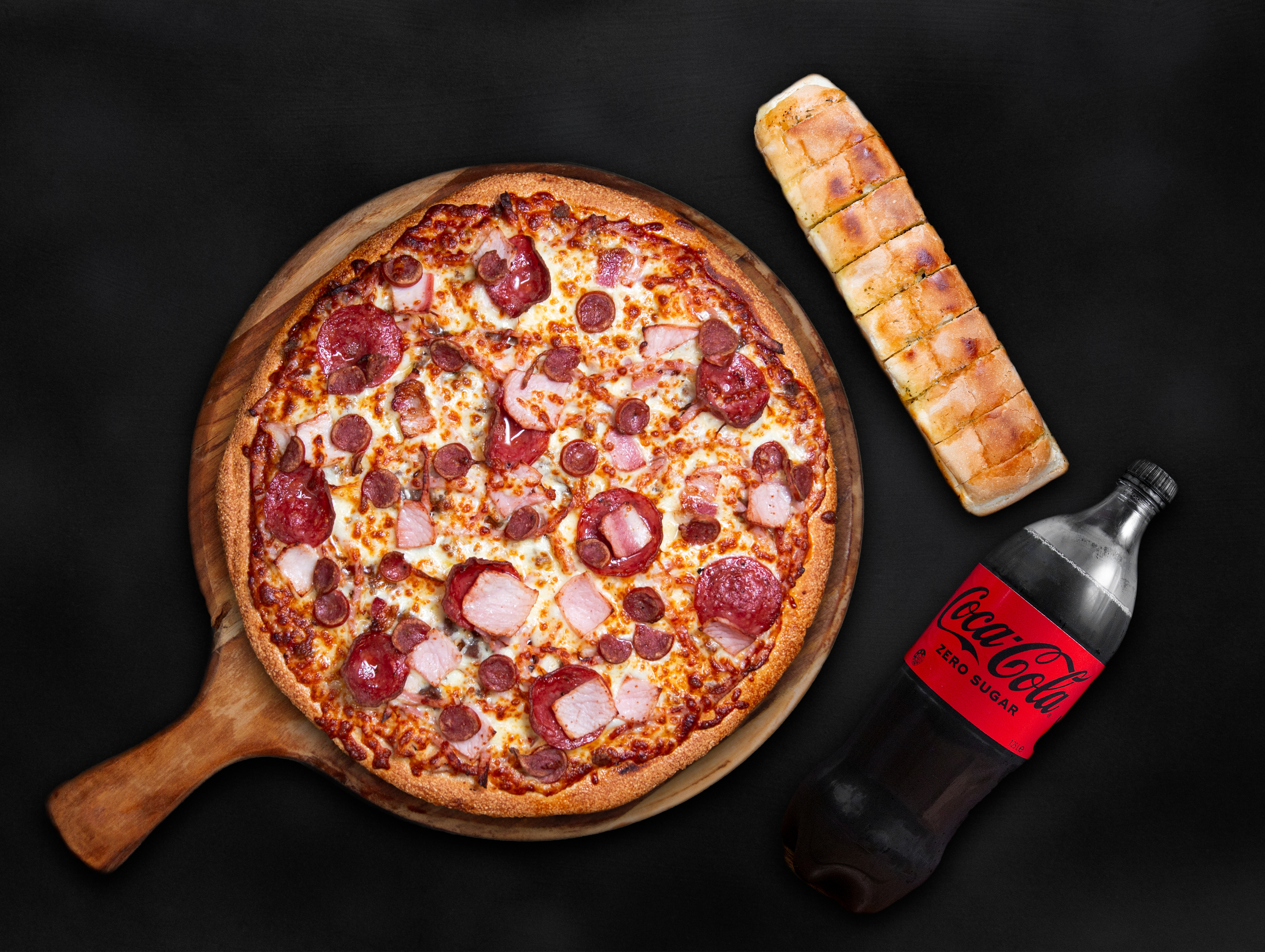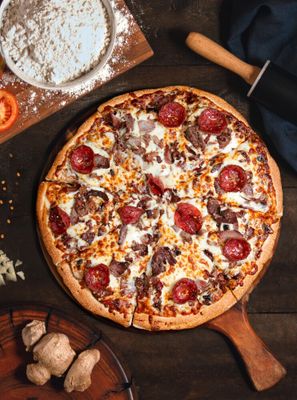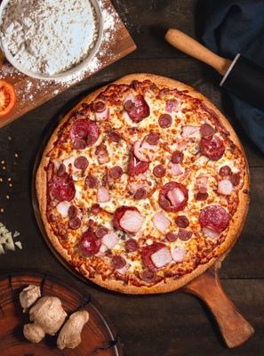 Bacon, Beef, Cabanossi, Ham, Pepperoni, Capsicum, Mushroom, Olives, Onion, Pineapple, Tomato and Mozzarella Cheese.