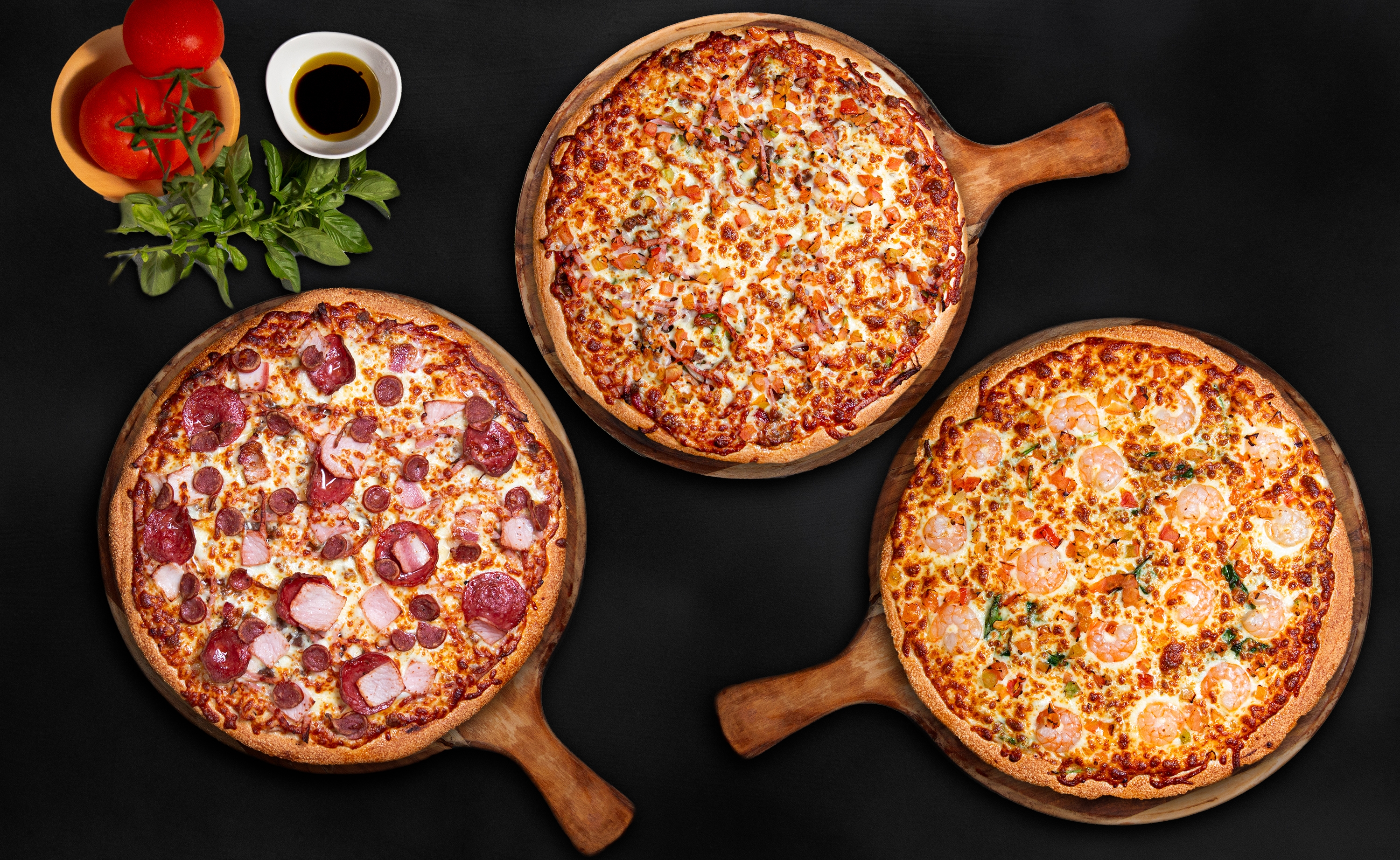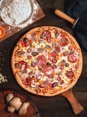 Tomato Base, Bacon, Cabanossi, Ham, Pepperoni, Capsicum, Mushroom, Olives, Onion, Pineapple and Mozzarella Cheese.