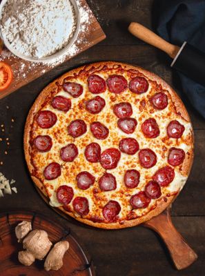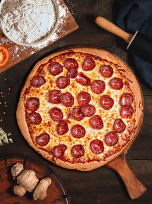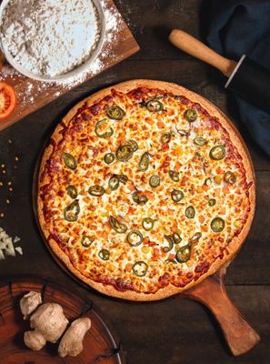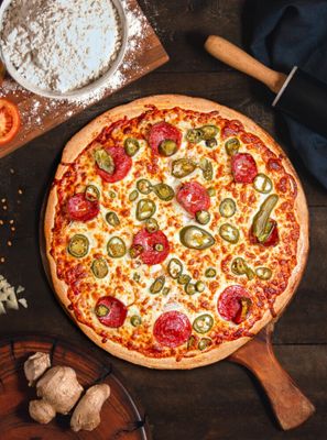 Tomato Base, Pepperoni, Jalapenos, Onion, Mozzarella Cheese and Chilli Flakes.