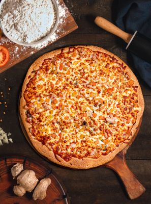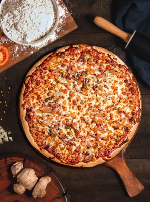 Tomato Base, Bacon, Chicken, Mushroom, Onion, Pineapple and Mozzarella Cheese.