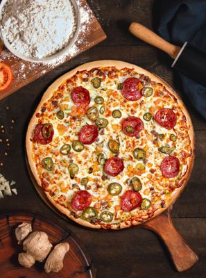 Tomato Base, Jalapenos, Onion, Spinach, Tomato, Mozzarella Cheese and Chilli Flakes.