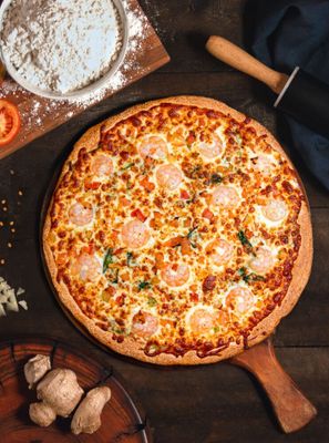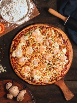 Tomato Base, Bacon, Mushroom, Mozzarella Cheese and Prawns.