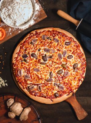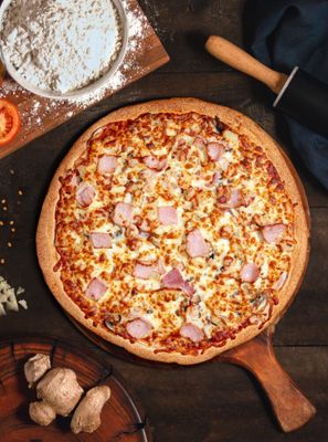Tomato Base, Ham, Mushroom, Olives and Mozzarella Cheese.