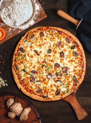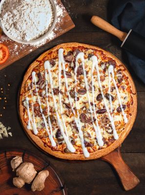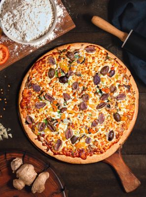 Cheesy Sauce Base, Chicken, Mushroom, Tomato, Mozzarella Cheese, Garlic and Oregano.