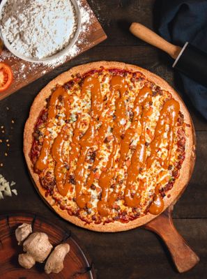 Tomato Base, Chicken, Capsicum, Onion, Tomato, Mozzarella Cheese and Satay Swirl.